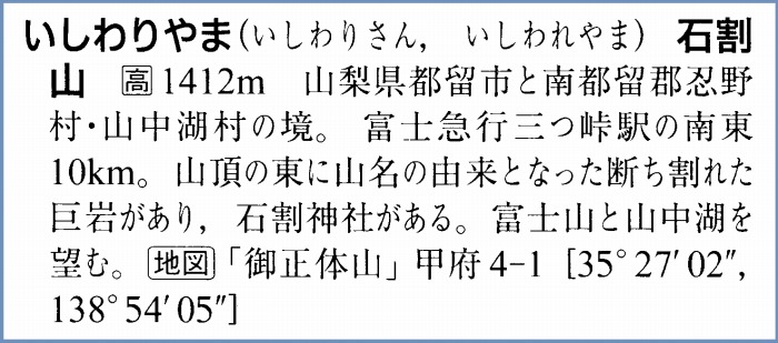 〔 石割神社 〕 石割山の八合目には、石割神社があり、その名の由来は神社の後方にある大岩が「石」という字に割れているのでその名がついたと云われ、無病息災のご利益があるとして崇敬をあつめています。言い伝えでは、「古事記」(712年)の中にある神話「天野岩戸」はこの場所であるともいわれています。これは石割神社の奥の院の二つに割れた隙間を三回通れば幸運が開けるといわれています。子供でも、大人でも、通ることができますが、服喪の人や悪いことをした人は岩に挟まれてしまうと言い伝えられています。また、この岩の割れ目から滴り落ちる水は、眼病・皮膚病などによく効く霊水として知れ渡っています。