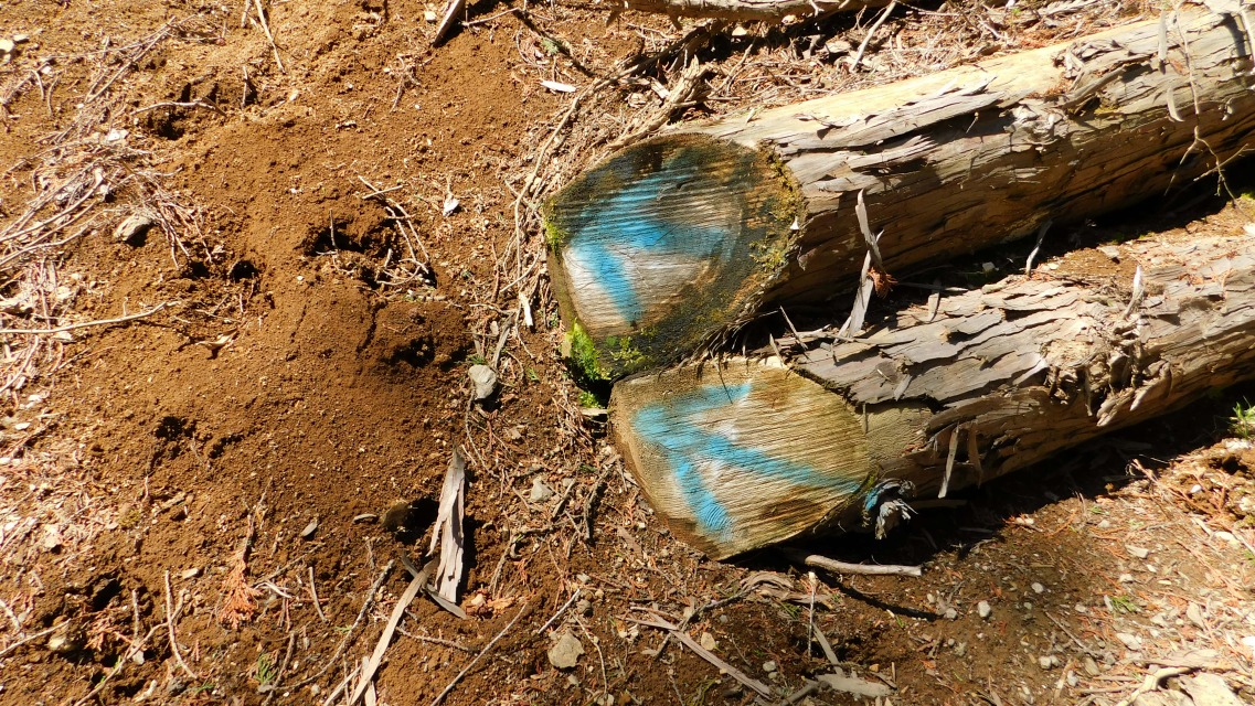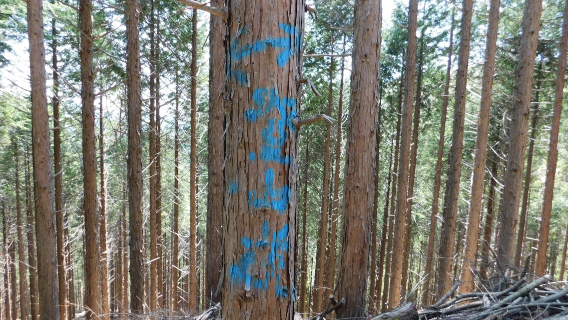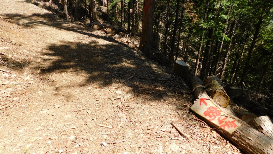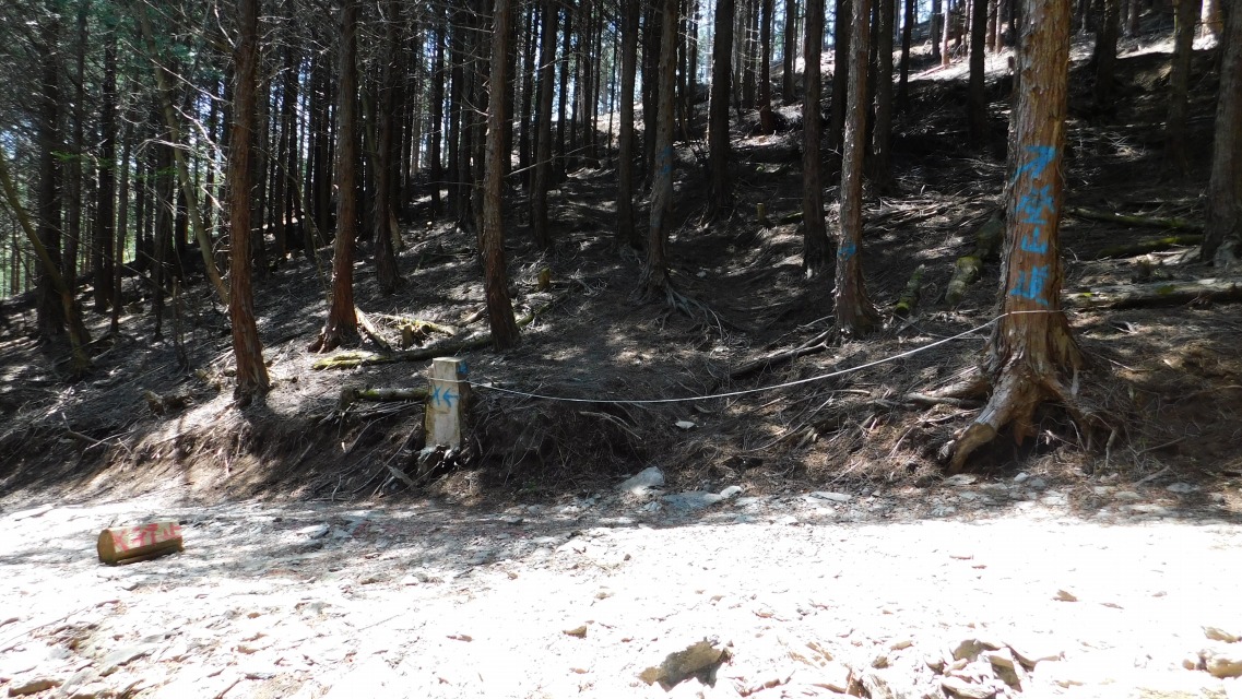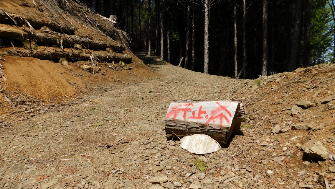 〔 16/97 〕 再び林道へ出る。左、赤い文字で「行止」。右、青いペンキの「 → 登山道」へ。