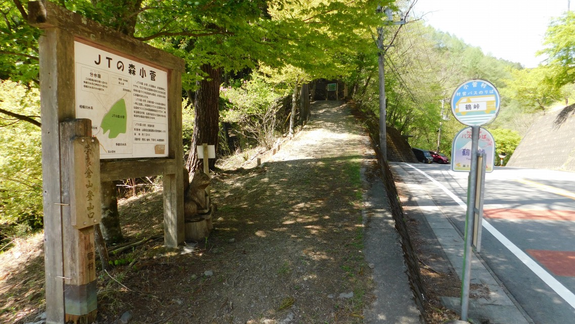 〔 3/97 〕 「奈良倉山 登山口」表示板・「JTの森 小菅」案内板・「鶴峠」バス停スタンドがある