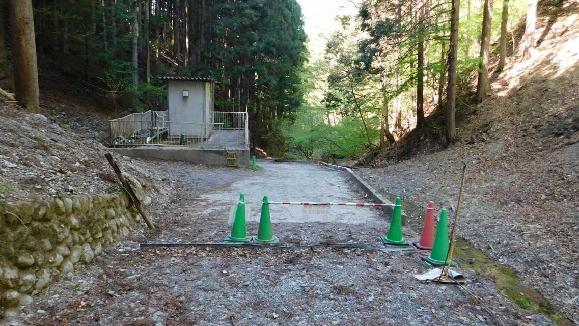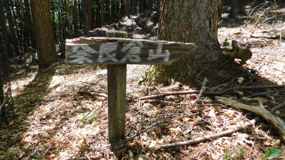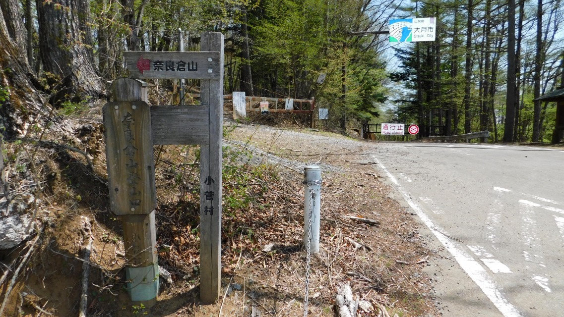 〔 48/97 〕 「奈良倉山登山口」表示板。後ろを振り返って。大月市へは「通行止」。