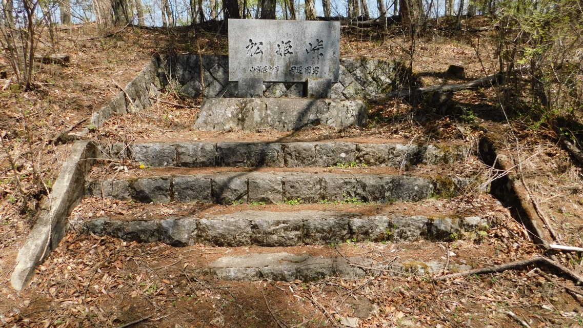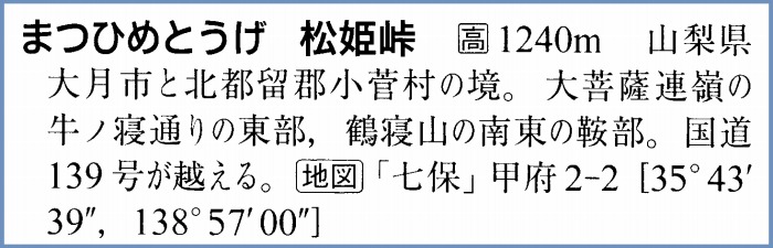 〔 松姫峠由来 〕 武田勝ョは一族をあげての戦いに利あらず天正10年3月天目山に散った。妹松姫は従臣と共に府中(甲府)を後に八王子に避難の折、当所附近を通過したる史上の伝説に因みここに松姫峠と命名された。昭和44年10月建之 大月市・小菅村 |