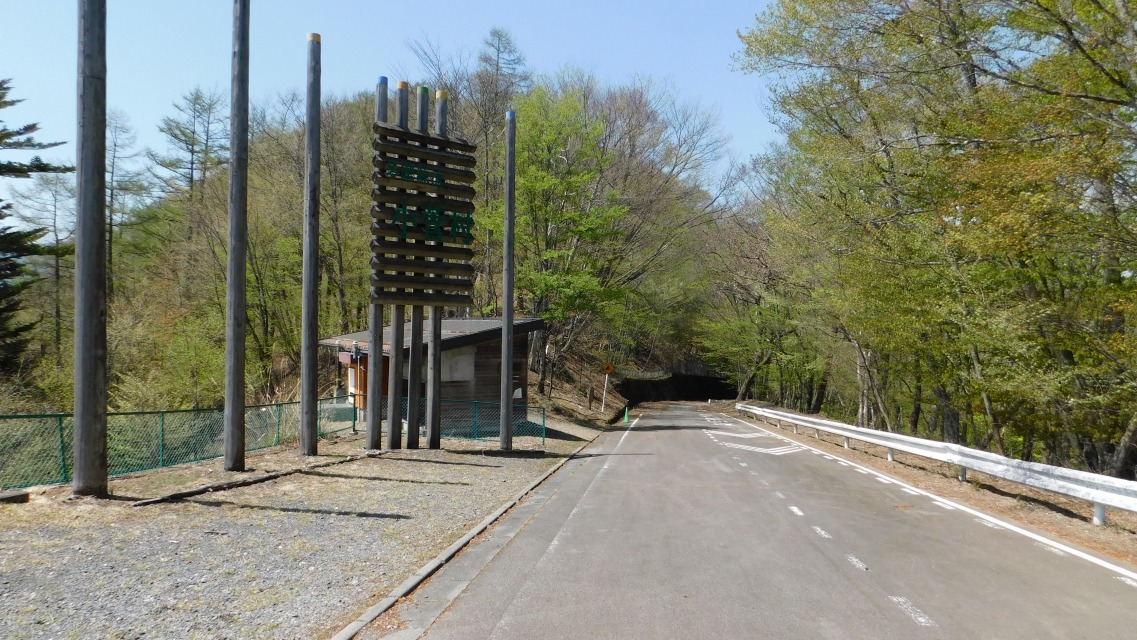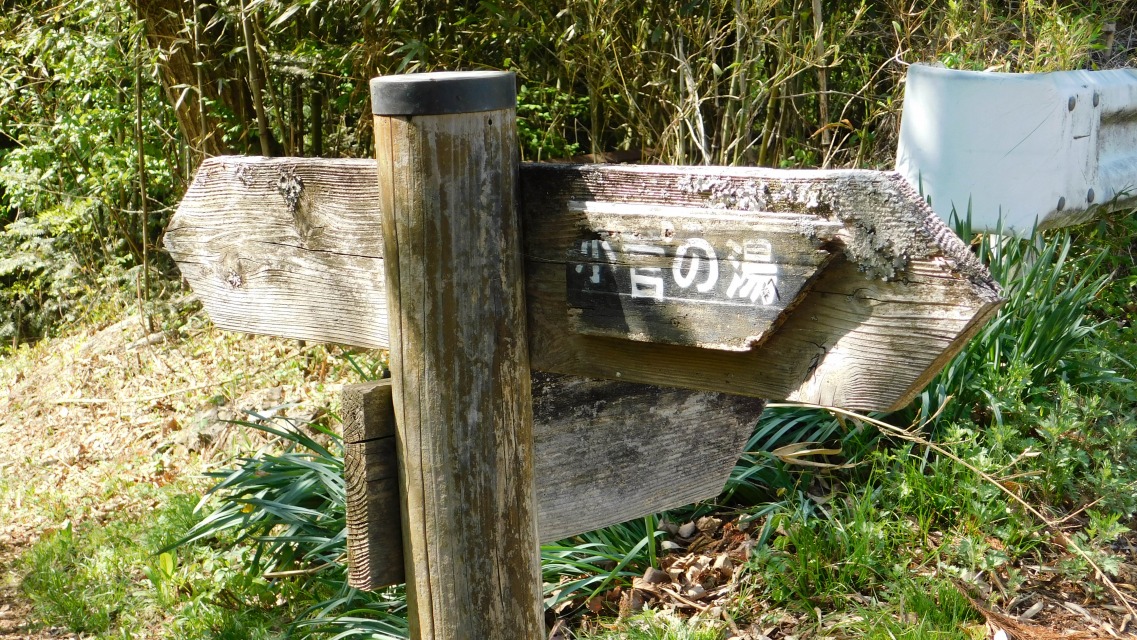 〔 90/97 〕 ガードレールの表示板を確認。「小菅の湯 → 」。