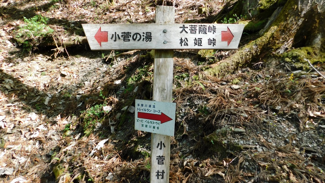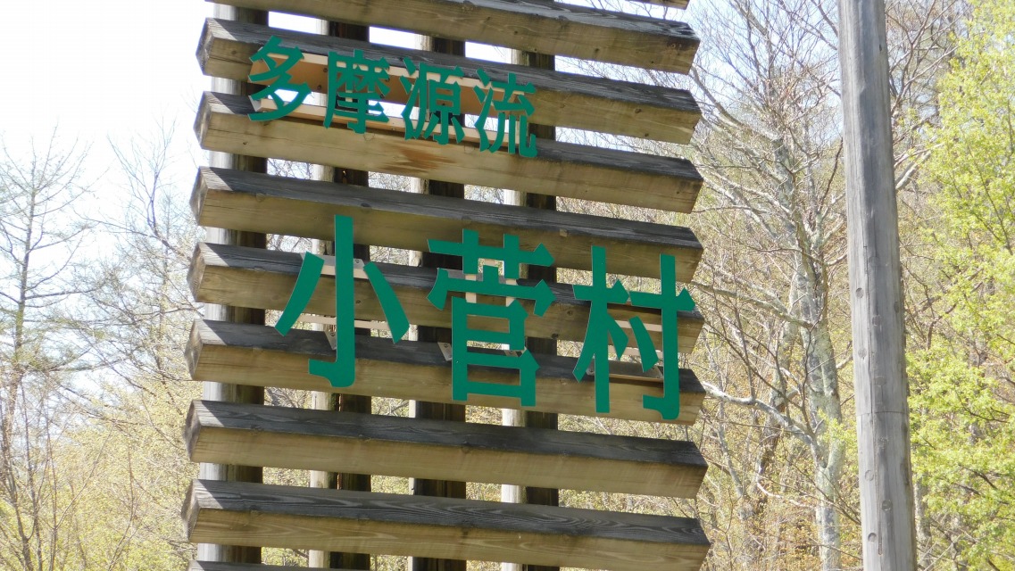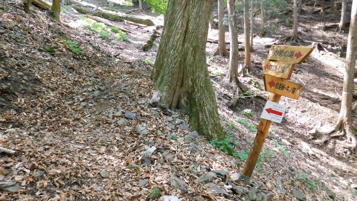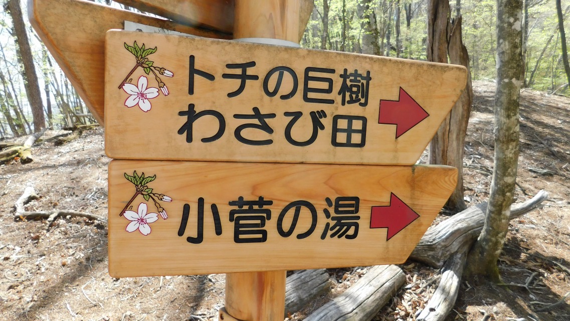 〔 74/97 〕 表示板確認。「トチの巨樹/わさび田 → 」・「小菅の湯 → 」へ。同所にて。
