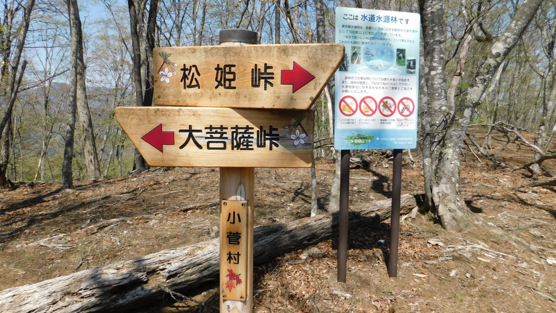 〔 64/97 〕 方角表示板。後ろは「ここは水道水源林です」の案内板。