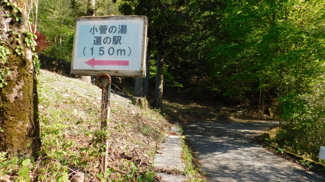 〔 89/97 〕 「小菅の湯 道の駅(150m)← 」。後ろを振り返って。