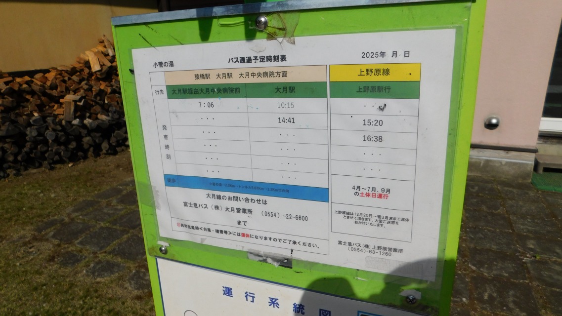 〔 97/97 〕 時刻表。「上野原駅行/4月〜7月・9月の土休日運行」。3:20発に乗る(4:38発が最終)。